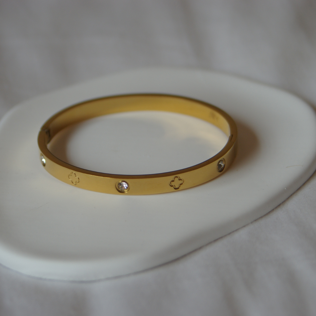 The Fortuna Bangle in Gold is the perfect combination of luck and sparkle. Made from 18K gold-plated stainless steel, this piece is delicate yet trendy with its clover and diamond design. This bangle is perfect for a minimal look on its own, or it can be the perfect addition to any bracelet stack.